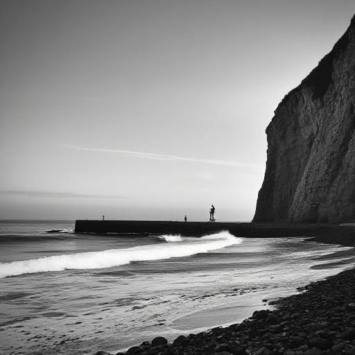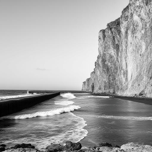 Autrement dit, j’ai demandé une photo d’une falaise, en noir et blanc avec un brise-lames avec des vagues.