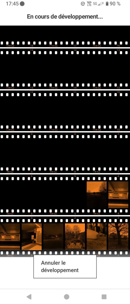 Je teste pour le moment le mode argentique, et je ne suis pas du tout convaincu. Je vous inviterais à prendre plutôt pour cet usage un appareil CampSnap. En mode argentique, vous ne pouvez plus changer de simulation de film, de mode de prise de vue, ni utilser la visée écran, ni transférer vos images tant que vous n’êtes pas arrivé au bout de votre « pellicule ». De plus le nombre minimum de prises de vue dans lequel on est bloqué est de 36 vues comme dans un film argentique. Donc cela vous impose de rester dans ce mode, pour 36, 54 ou 72 vues, et ce tant que vous n’êtes pas arrivé au bout de votre « film ». Une fois le transfert lancé, le développeent est démarré, comme vous pouvez le constater ci-dessous.